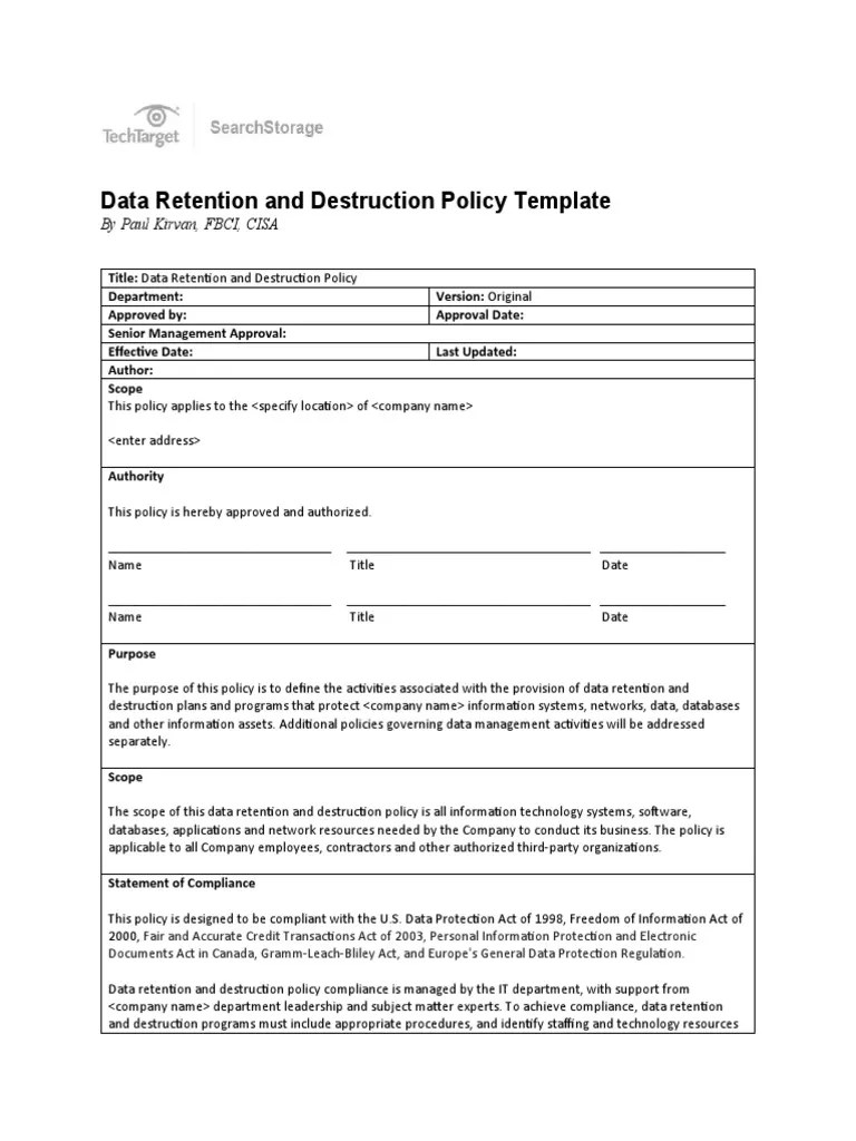 Data Retention and Destruction Policy Template by Paul Kirvan, FBCI